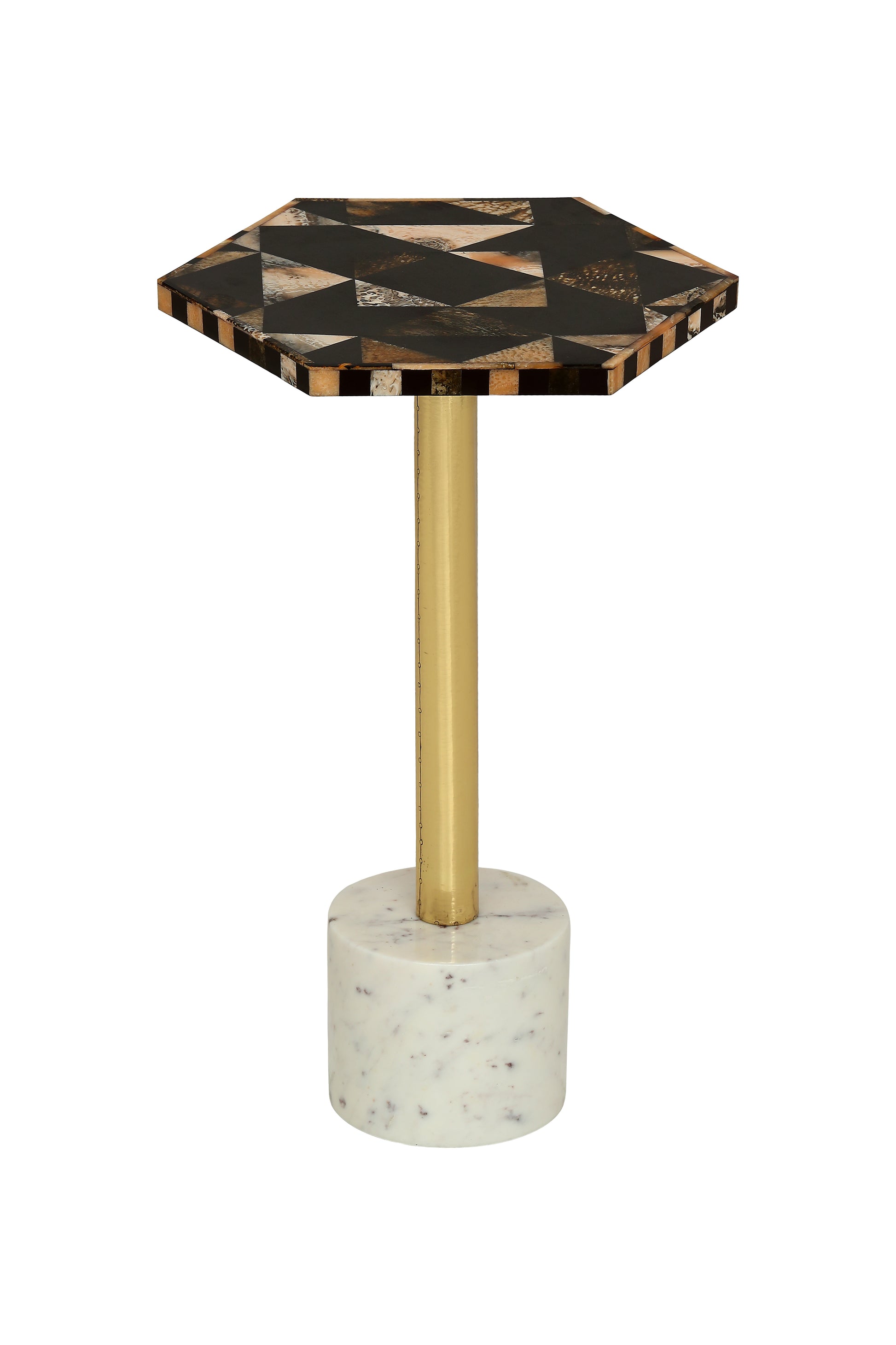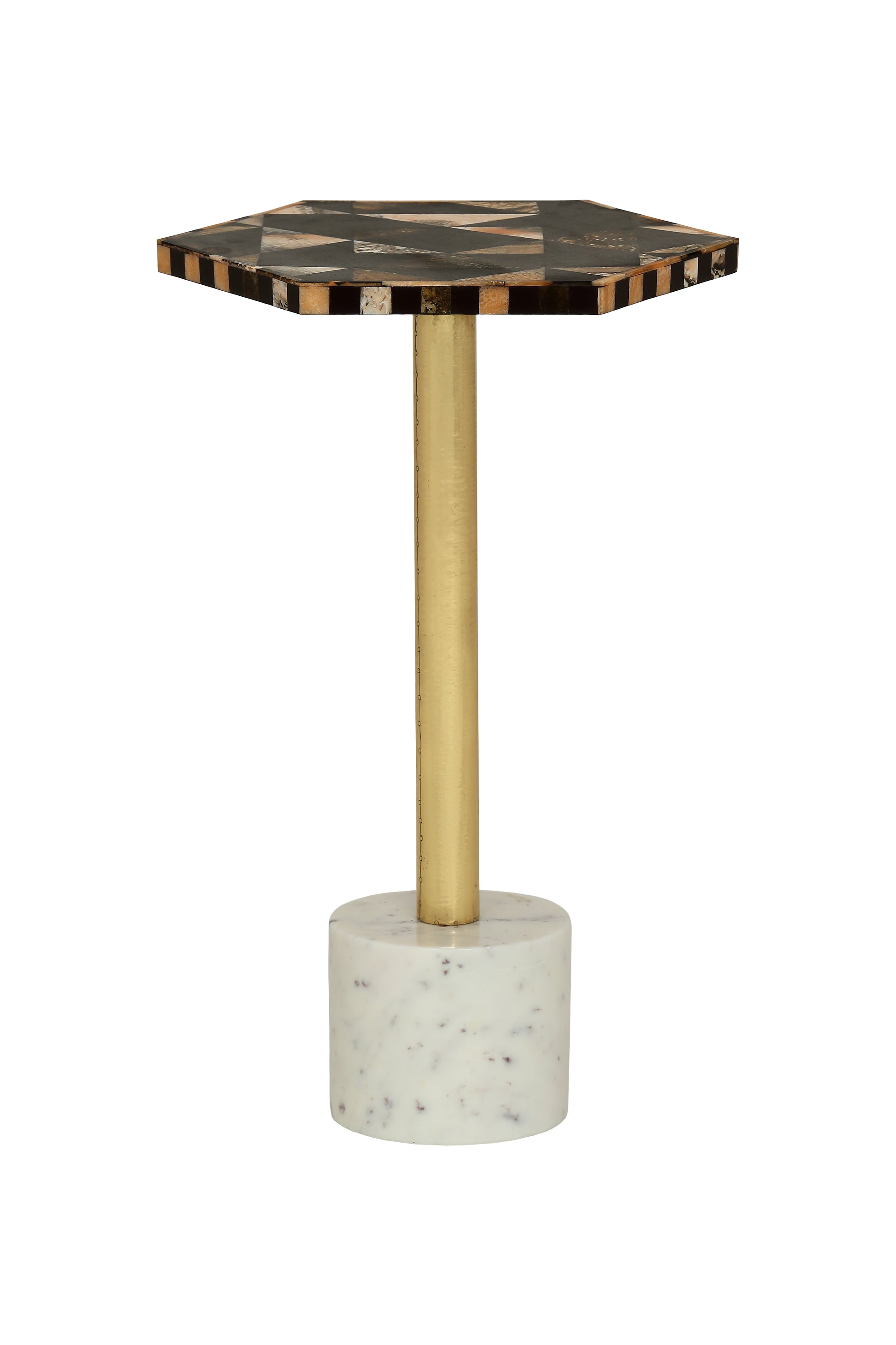 This side table is a captivating interplay of textures and materials, exuding understated luxury. The hexagonal top, a testament to intricate craftsmanship, showcases a mesmerizing mosaic of colors and patterns. This artistic masterpiece is elegantly supported by a slender brass-painted iron stand, adding a touch of warmth and sophistication. The base, a solid marble disc, echoes the top's luxurious texture, creating a cohesive and refined look. This table is not merely a functional piece but a statement of refined taste, adding a touch of eclectic glamour to any space.