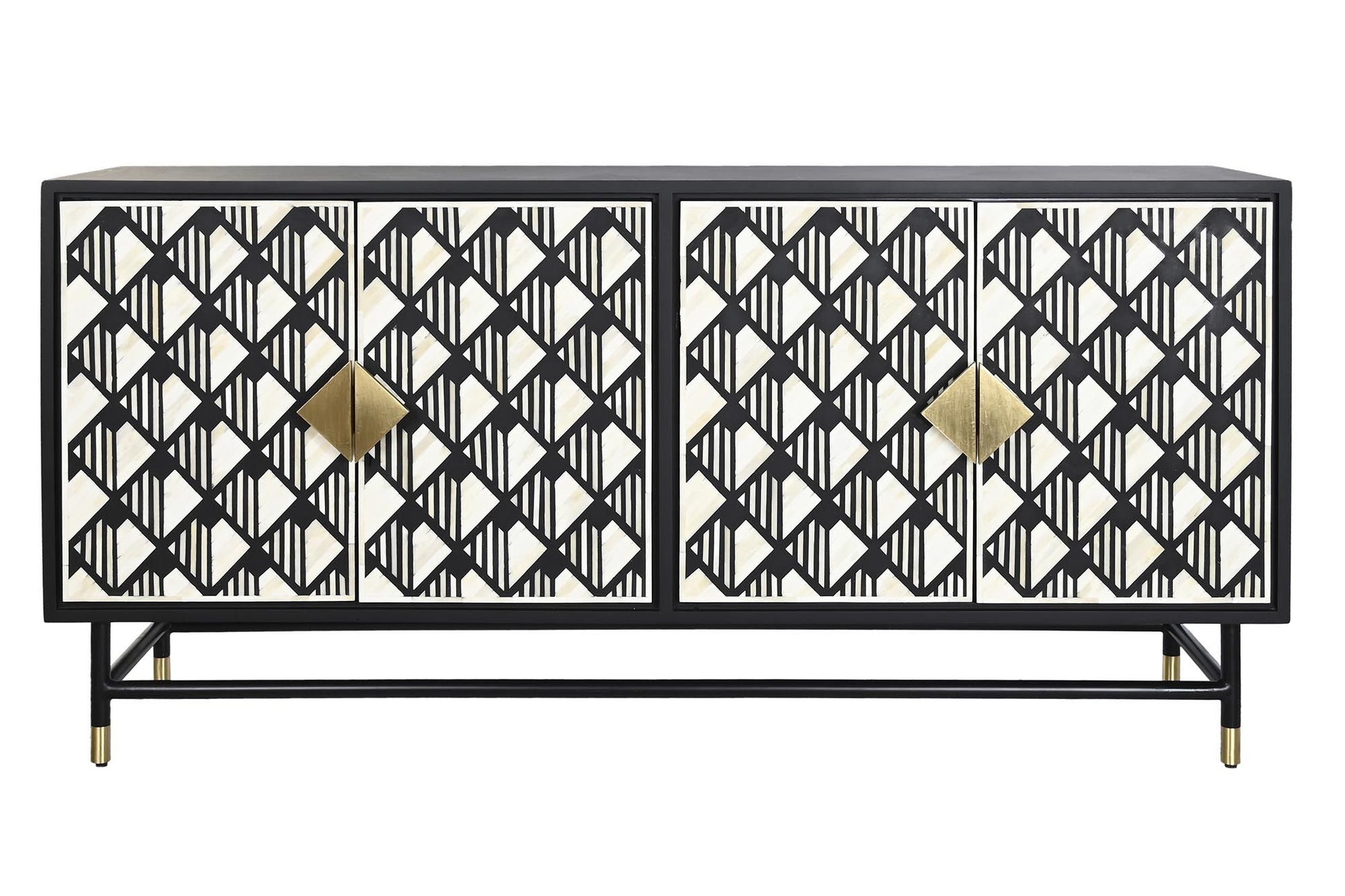 The Diamond Credenza is a hand-crafted masterpiece, featuring an intricate black-and-white diamond pattern accented with golden geometric handles and sleek metal legs with gold tips, exuding sophistication and modern charm. Designed to elevate any space, it offers ample storage for tableware, books, or electronics, making it perfect as a buffet, console, or TV stand. Pair it with neutral wall colors like ivory or beige for subtle elegance, or bold tones like navy or emerald for striking contrast. This sideboard is the epitome of art and utility, seamlessly blending style and practicality to enhance your home decor.