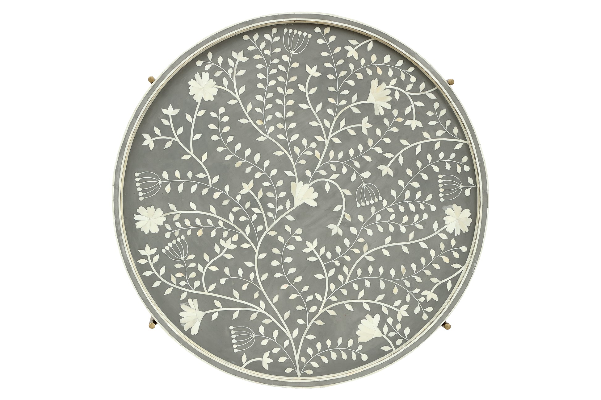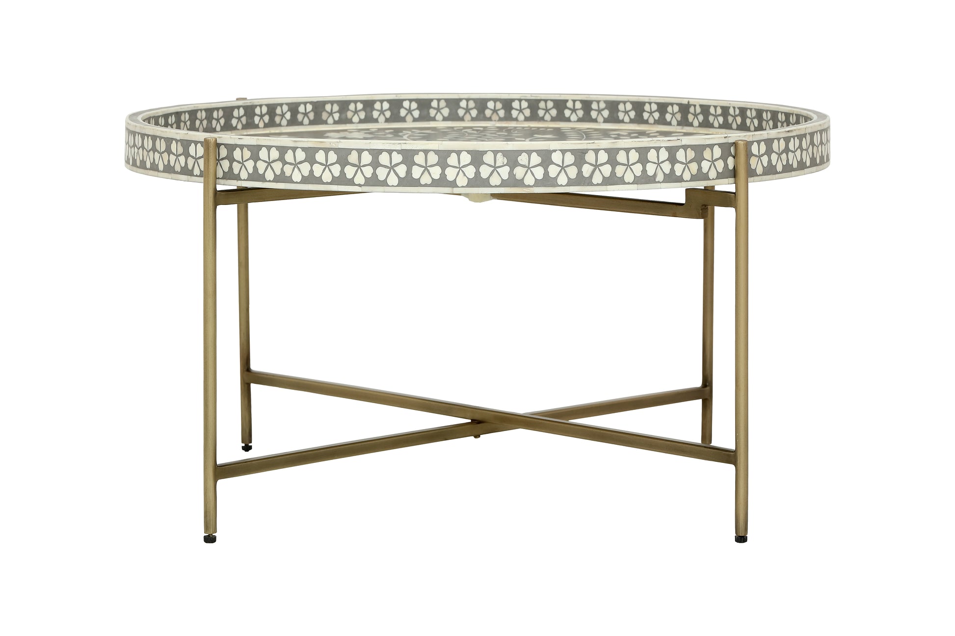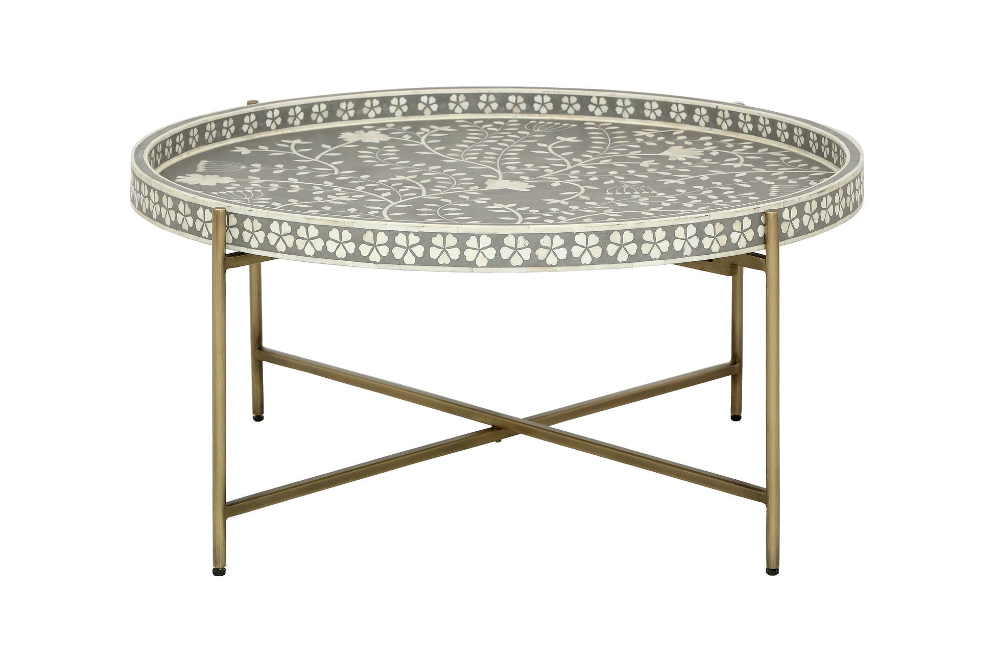 Blending tradition with contemporary finesse, the Elisha Coffee Table showcases intricate bone inlay work on an engineered wood surface, beautifully complemented by a brass-painted iron stand. Its handcrafted floral patterns exude artisanal charm, making it a striking focal point in any living space. Ideal for displaying decorative accents, serving guests, or adding a touch of heritage to modern interiors, this table pairs effortlessly with neutral tones, soft textures, and metallic décor. Elevate its grandeur with a chic vase, scented candles, or a stack of coffee table books for a sophisticated, well-curated aesthetic.