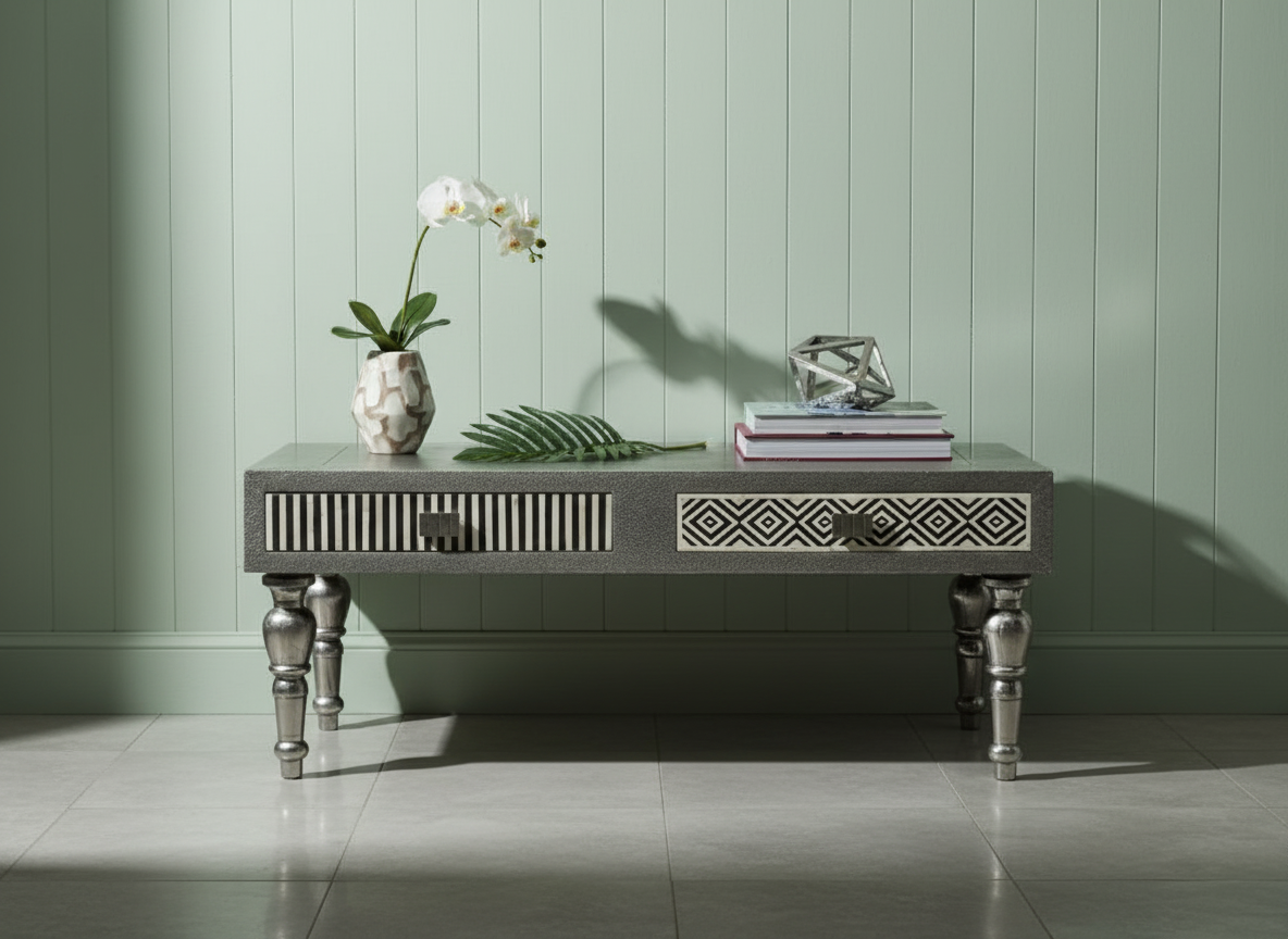 A stunning fusion of engineered wood, intricate bone inlay, and striking metalwork, this center table is a masterpiece of craftsmanship and modern design. The geometric inlay patterns on the drawers add a striking contrast to the textured surface, while the metallic turned legs lend a regal touch. Perfectly balancing artistic heritage with contemporary aesthetics, this table makes a sophisticated statement in any living space. Pair it with a neutral or monochrome sofa to let the intricate details shine and elevate its bold appeal with sculptural vases or a statement tray.