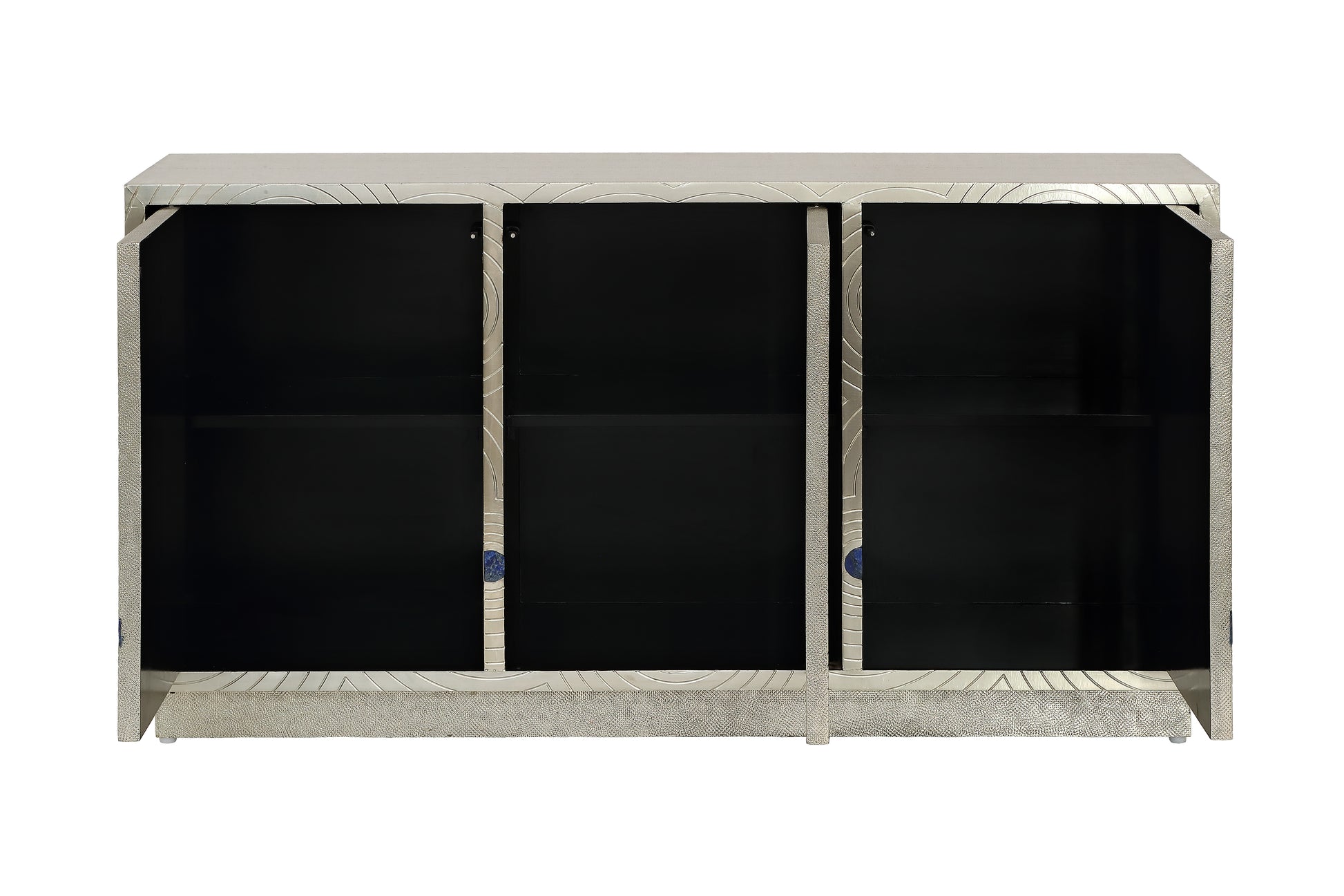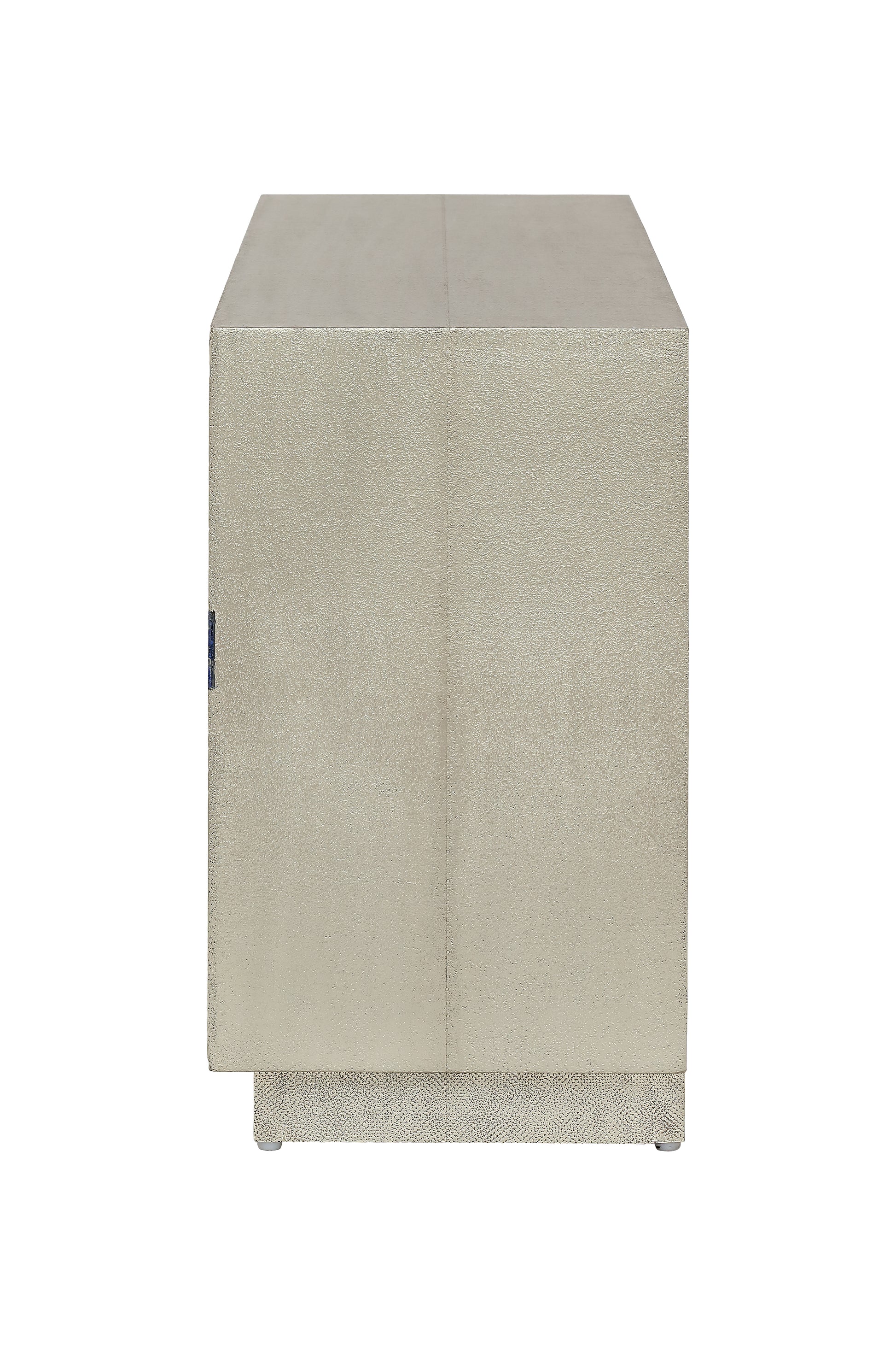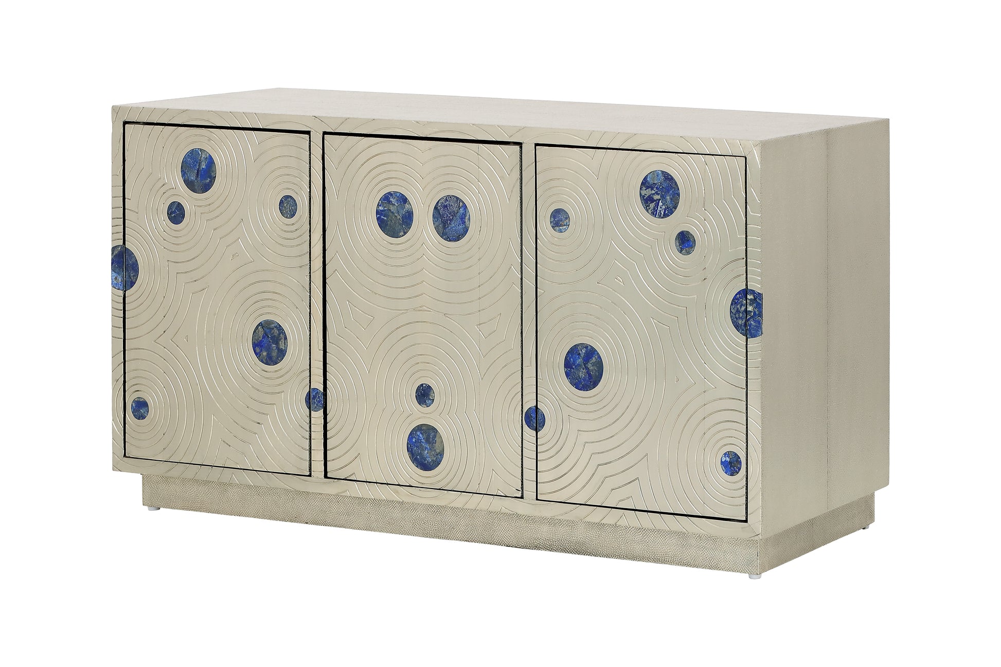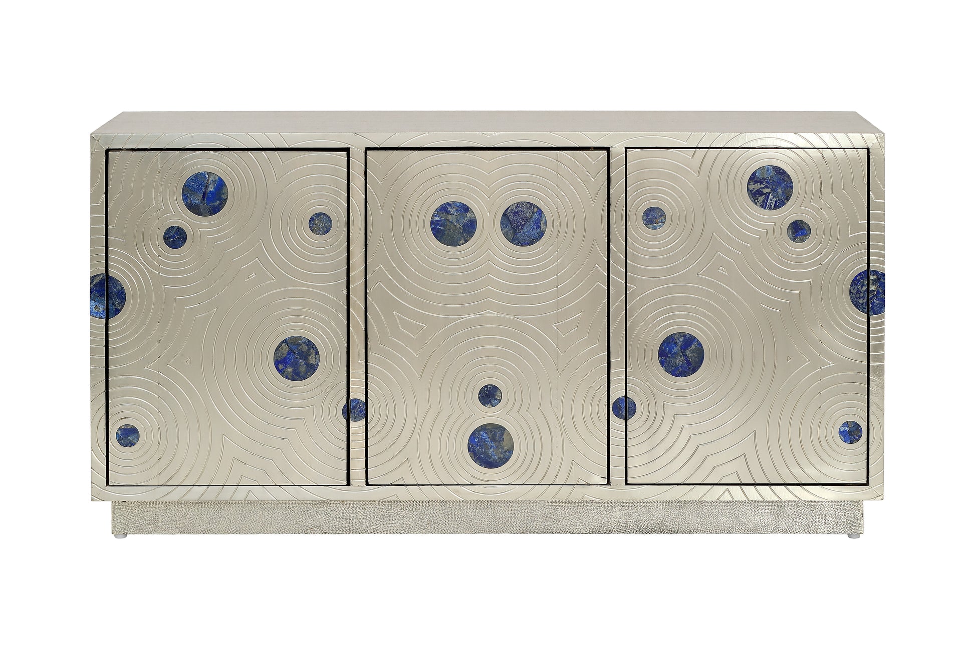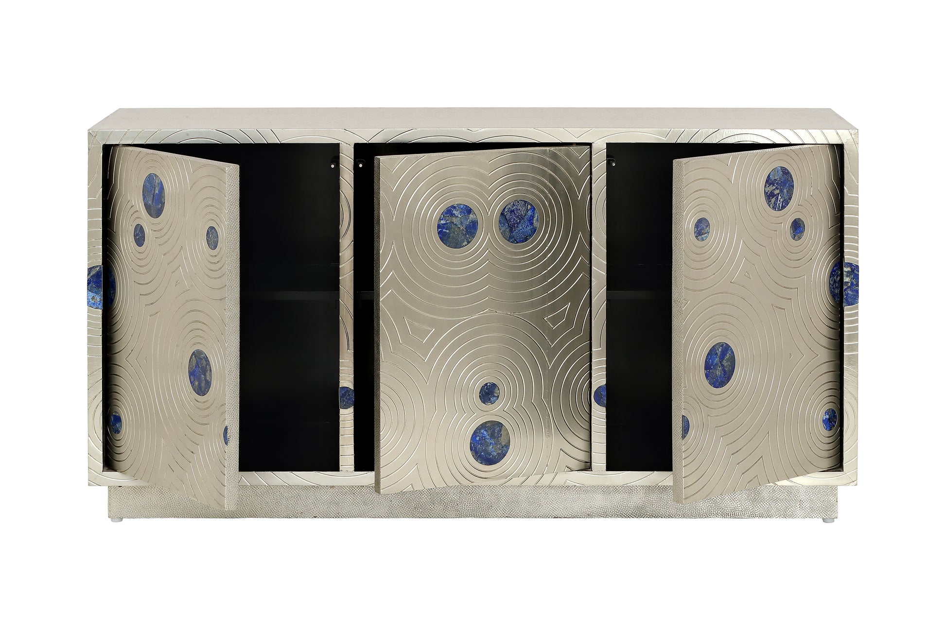 This stunning Galaxy Credenza is a celestial-inspired masterpiece that radiates elegance and refinement. The chest features a sleek, metallic finish with intricately embossed circular patterns, reminiscent of rippling cosmic waves. Adorned with deep blue, Lapis Lazuli gemstone, the design evokes a sense of the night sky, scattered with radiant celestial bodies. Perfect for elevating any living space, this credenza combines modern artistry with timeless elegance, making it an ideal centerpiece for those who appreciate fine craftsmanship and unique design.