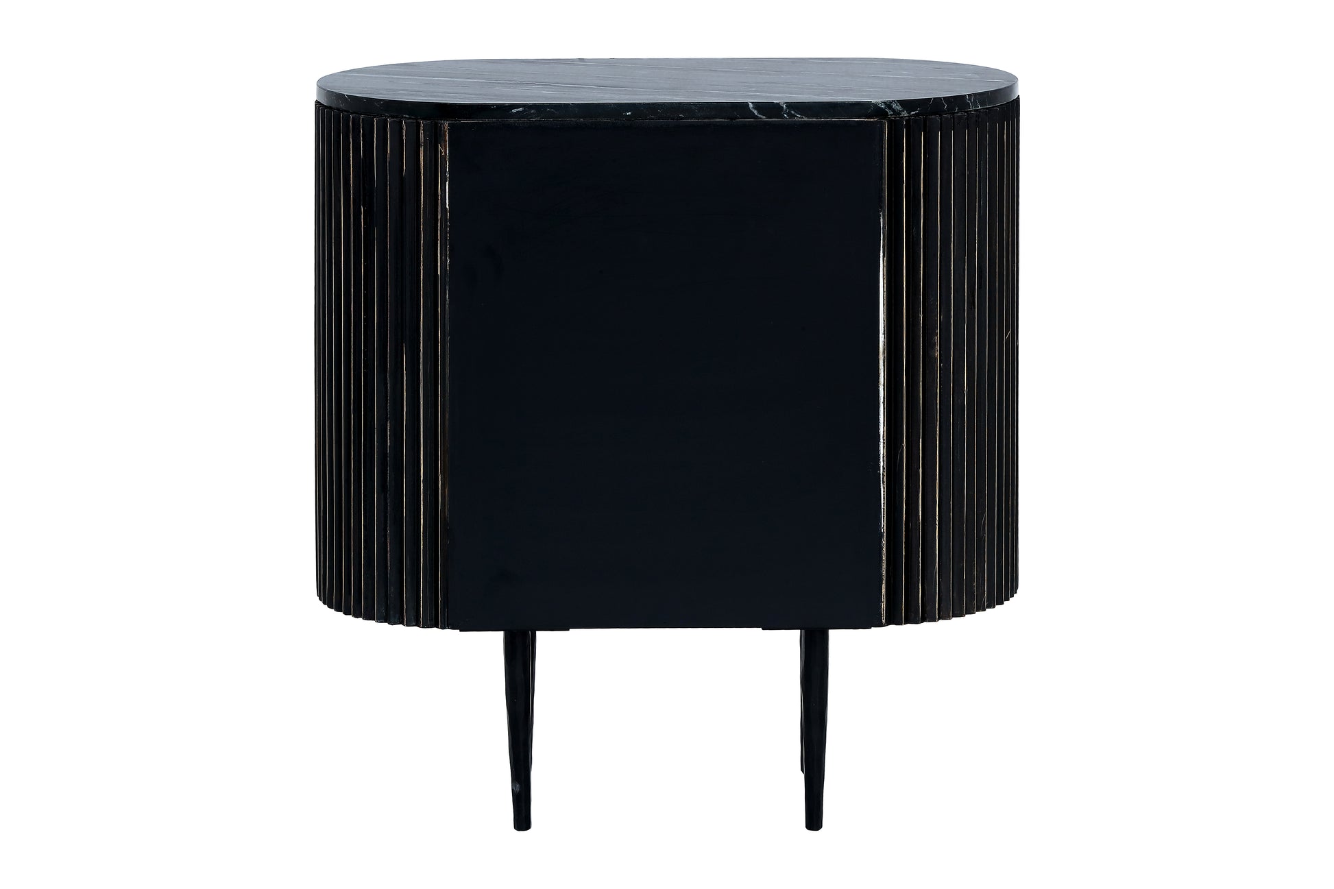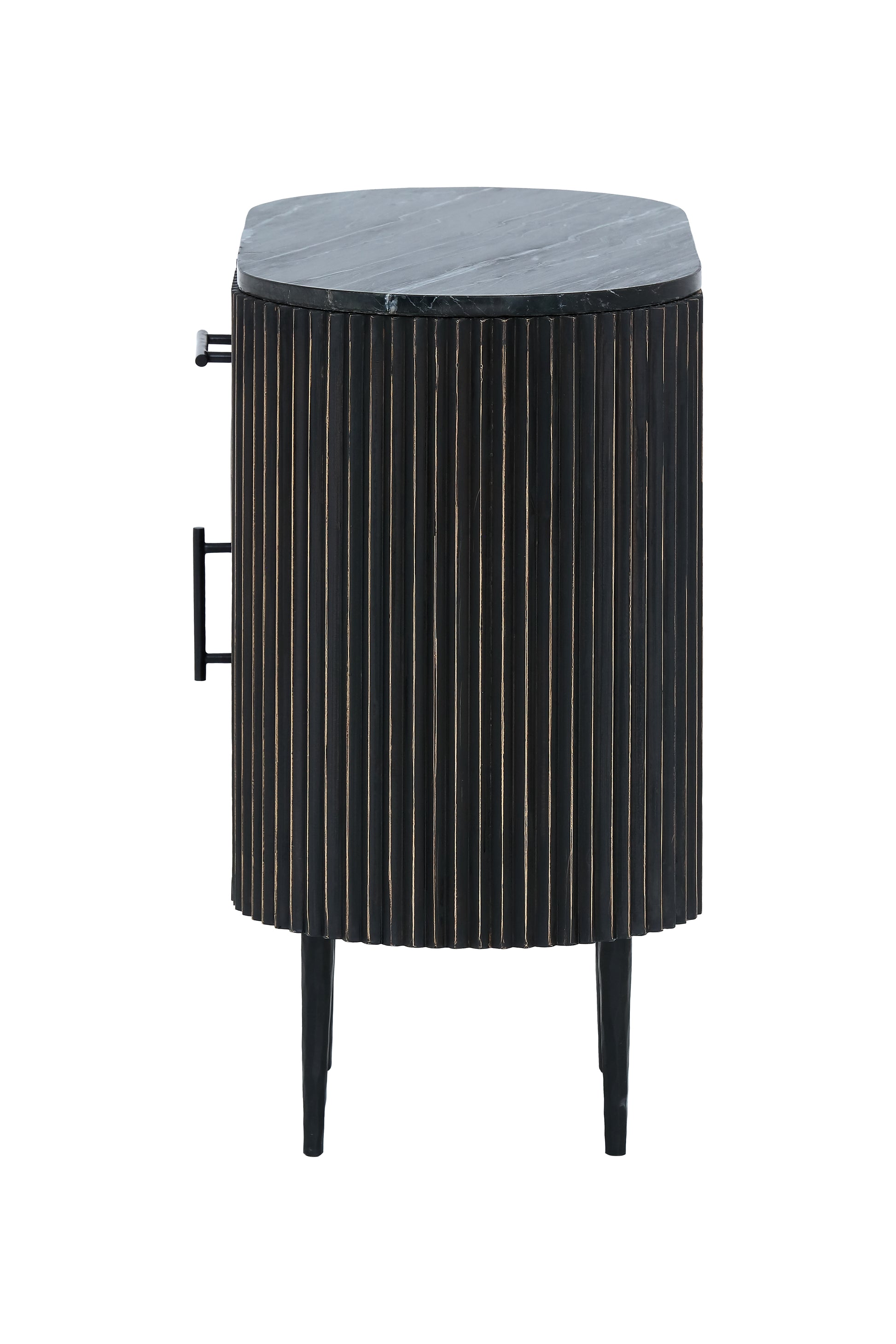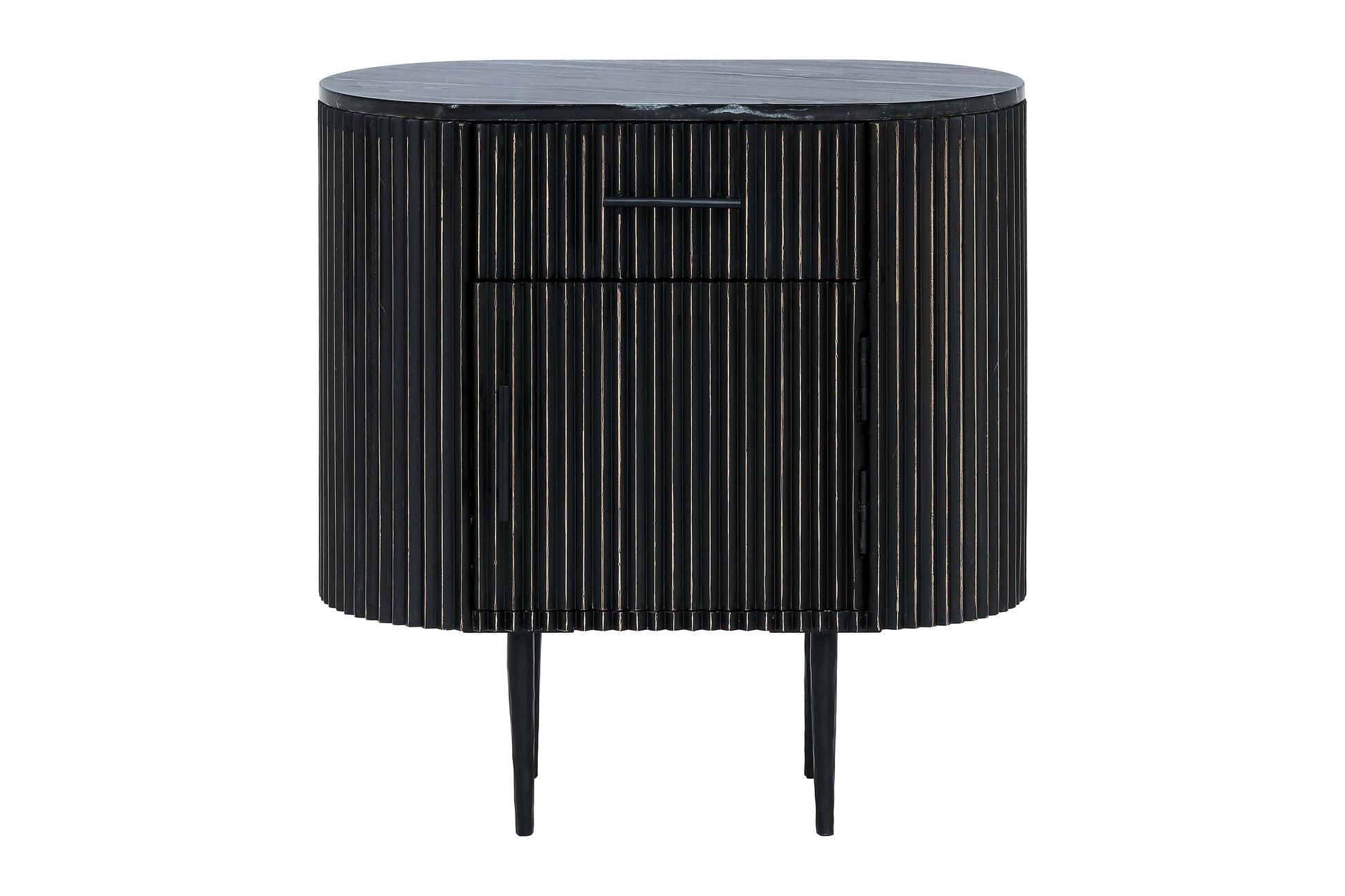 The Gatsby Bedside Cabinet exudes understated sophistication with its dark antique finish and finely grooved fluted façade. The rounded silhouette softens the bold vertical lines, while a black marble top adds a refined contrast and touch of luxury. Elevated on slim, tapered legs, this piece feels grounded yet graceful.