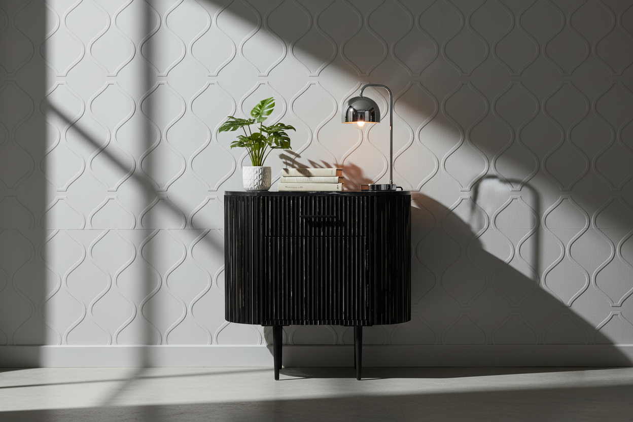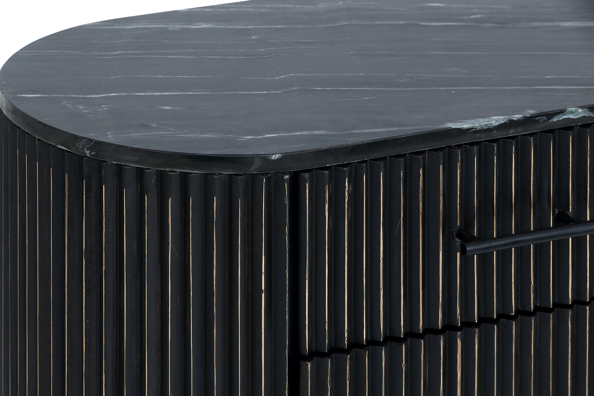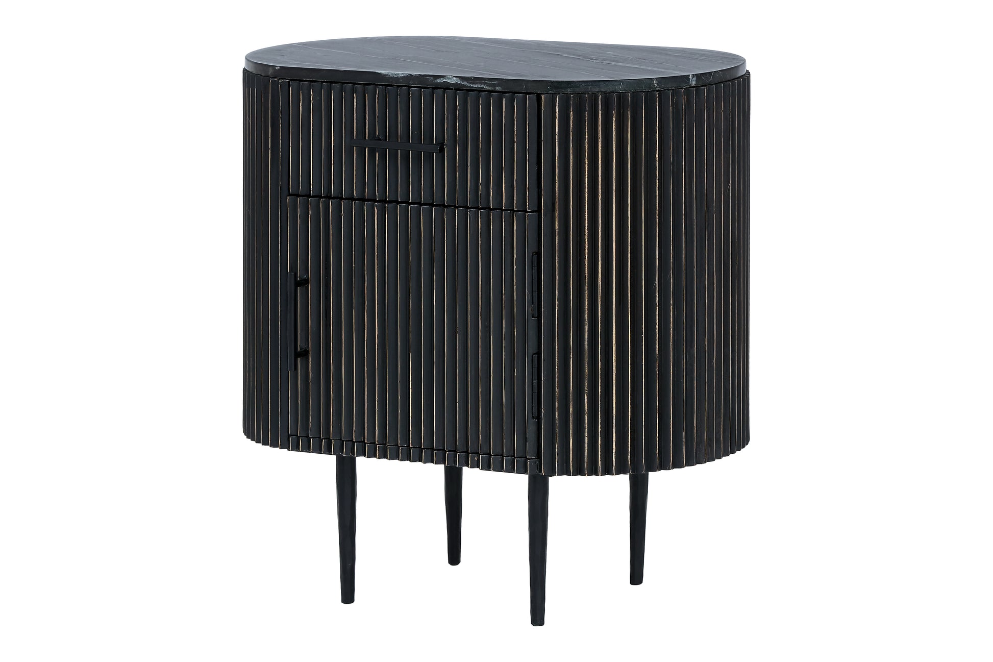 The Gatsby Bedside Cabinet exudes understated sophistication with its dark antique finish and finely grooved fluted façade. The rounded silhouette softens the bold vertical lines, while a black marble top adds a refined contrast and touch of luxury. Elevated on slim, tapered legs, this piece feels grounded yet graceful.