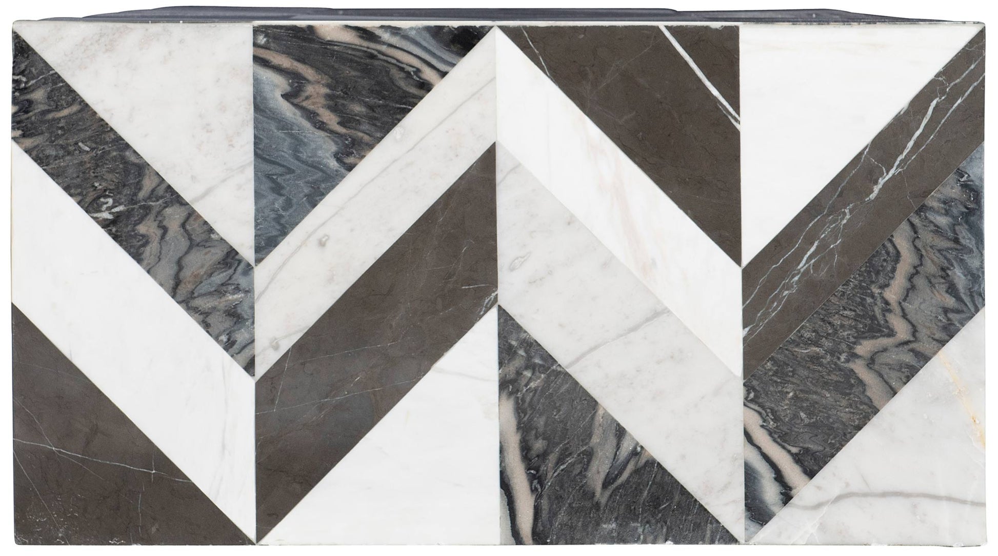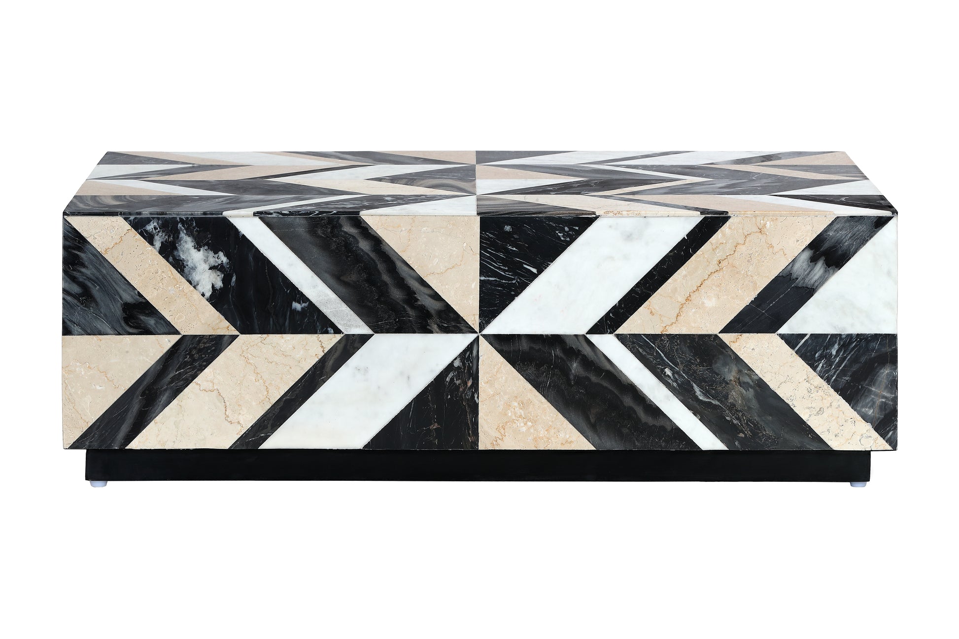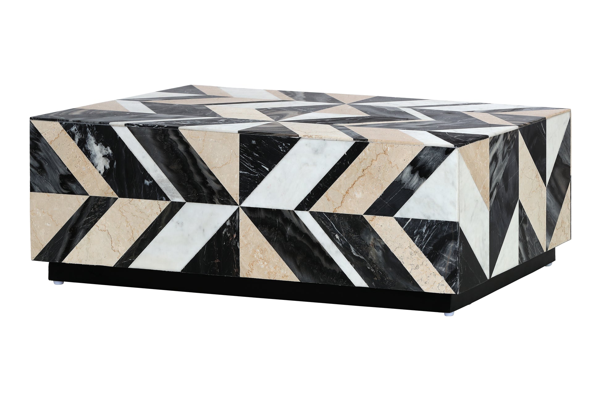 Strikingly crafted with engineered wood and an opulent marble inlay, the Geo Coffee Table showcases a bold interplay of angular patterns in black, white, and beige tones. Designed to command attention, this piece is as practical as it is artistic - perfect for hosting coffee conversations, exhibiting decorative accents, or simply adding a sculptural element to your space. For a seamless aesthetic, pair it with earthy textures like a woven rug or accessorize with minimalist décor to let the geometric design take center stage.