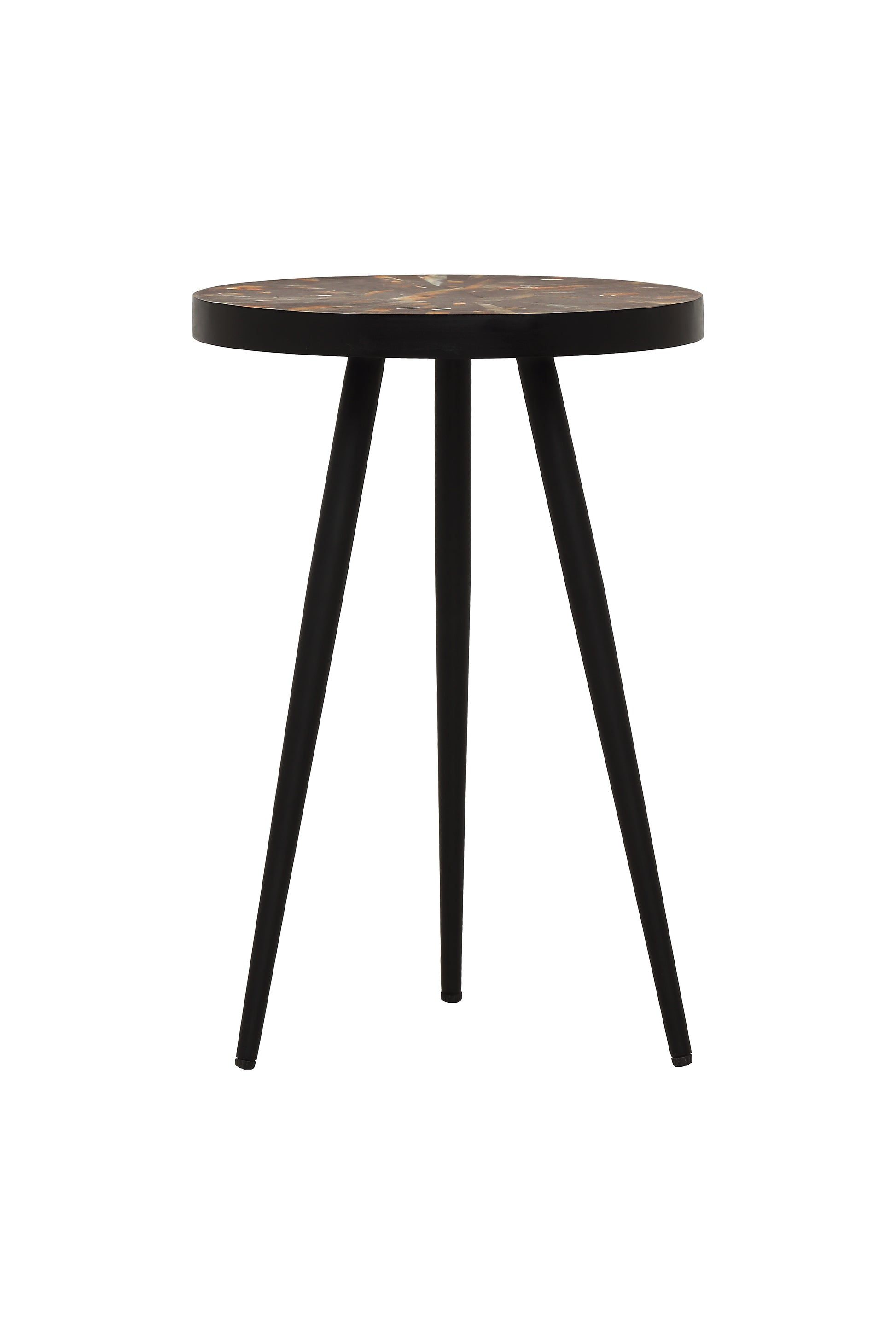 A striking harmony of natural elegance and modern allure, this side table redefines sophisticated design. The circular tabletop, expertly crafted from engineered wood and adorned with a mesmerizing resin inlay, evokes the wonder of swirling galaxies and celestial marvels. Poised atop a trio of slender, sleek iron legs, it effortlessly merges organic elegance with industrial chic. More than just a functional piece, it serves as a statement of refined taste and eclectic charm, bringing an air of timeless glamour to any interior.