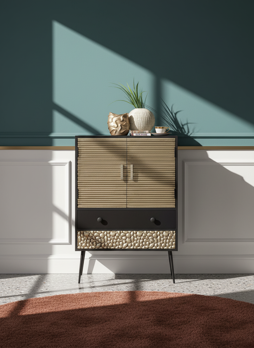 The Mudra Bar Cabinet strikes a balance between bold texture and refined form. Its hand-clad brass doors feature clean, architectural ridges, while the lower drawer’s hammered surface brings an organic, tactile contrast. Elevated on sleek matte black legs, the silhouette is both grounded and graceful.