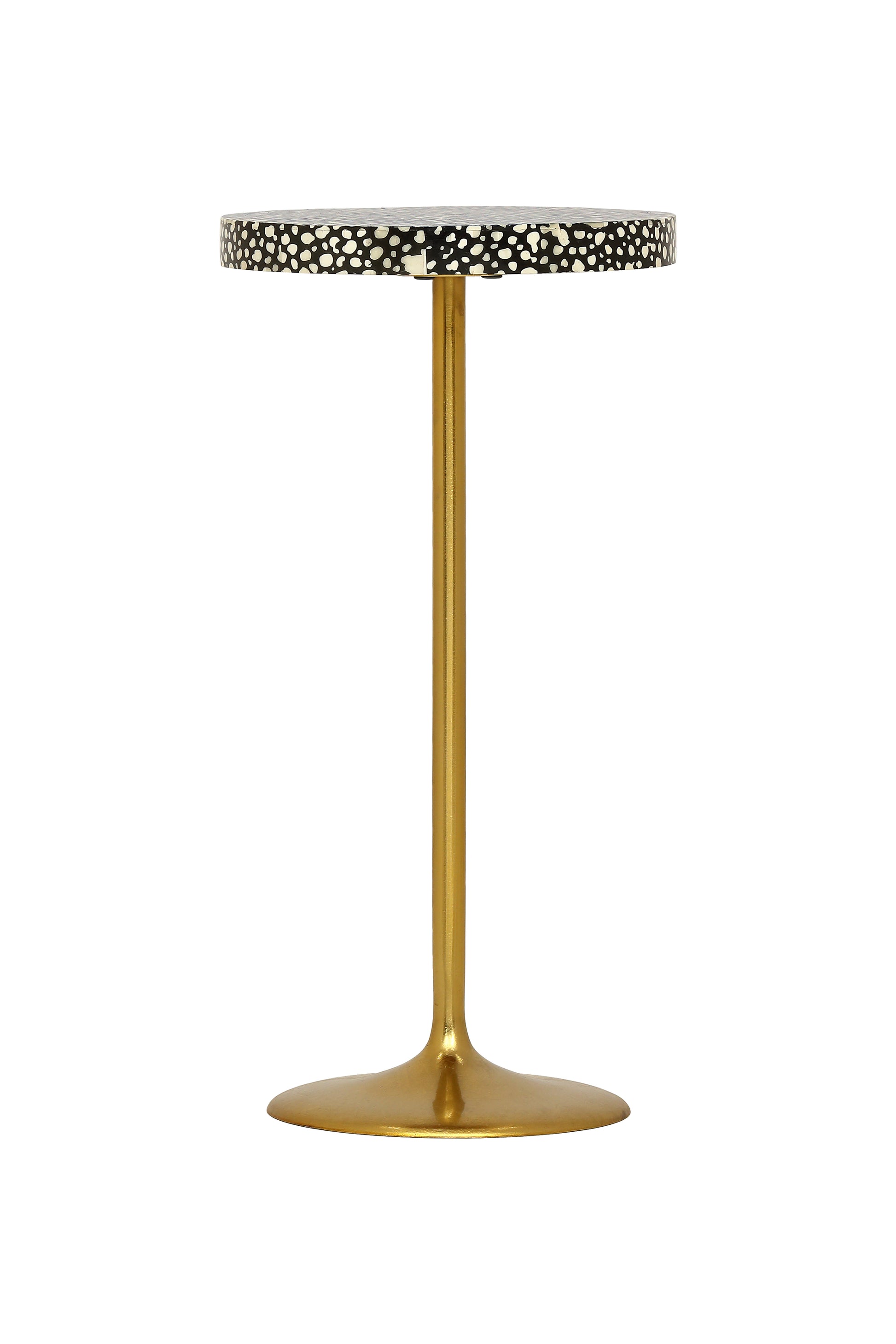 An entrancing fusion of natural elements and modern artistry, this side table exemplifies unparalleled craftsmanship. The engineered wood top, adorned with a mesmerizing bone inlay pattern of intricate black and white motifs, radiates sophistication and timeless allure. Resting gracefully on a sleek iron base finished in a luxurious brass tone, the table achieves a perfect balance of refined texture and warm metallic sheen. The luminous inlay paired with the opulent brass-painted base creates a captivating interplay of materials, making this piece more than just functional - it is a statement of impeccable taste. An embodiment of understated luxury, it elevates any interior with its graceful presence and contemporary charm.