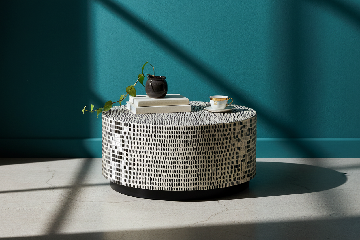 A striking fusion of contemporary design and artisanal craftsmanship, the Splash Coffee Table is crafted from engineered wood and adorned with intricate bone inlay, creating a rhythmic visual texture that captivates. Perfect as a statement centerpiece in your living space, it offers both functionality and artistic flair. Style it with metallic décor accents, a sleek tray, and a pop of greenery to balance its bold pattern while keeping the look effortlessly chic.