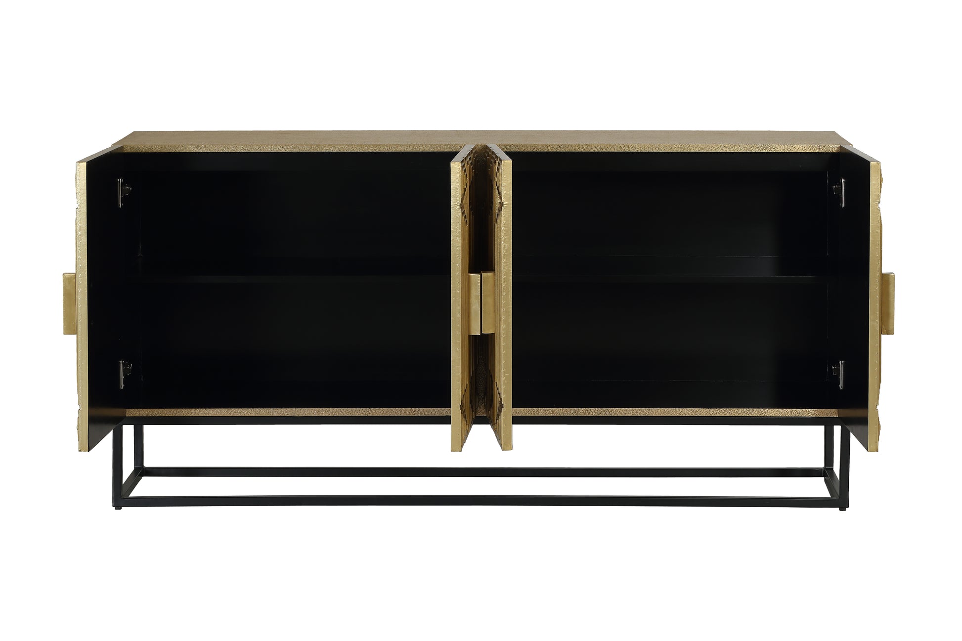 The Step Credenza is a stunning fusion of contemporary design and timeless glamour. Featuring a luminous gold finish with intricately layered step patterns, it exudes a sense of bold sophistication. The sleek black metal base adds a touch of modern minimalism, creating a perfect harmony between elegance and functionality. This eye-catching piece brings a unique charm to any space, making it an ideal choice for those who appreciate distinctive craftsmanship and artistic flair. Both stylish and versatile, it elevates interiors with its luxurious yet understated appeal.